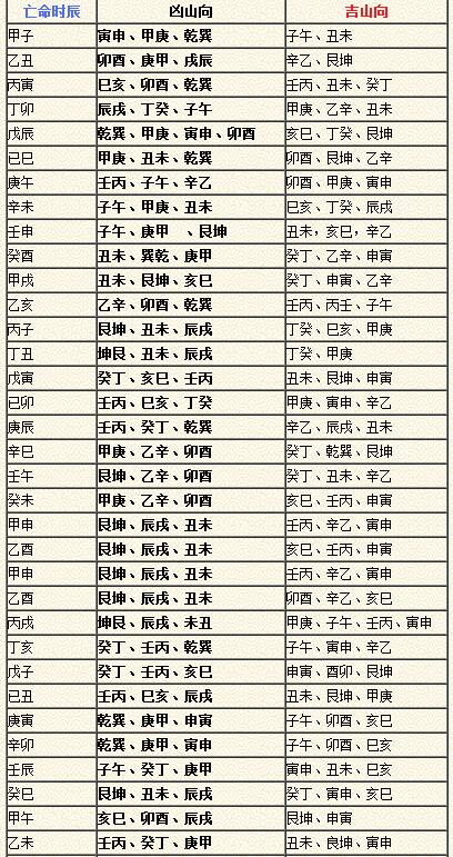 壬戍亡命:不葬丑未、坤艮、辰戍。葬后三四年内长房出官司,中房损败克妻,小房出聋哑。宜用子午、癸丁、壬丙主大吉。