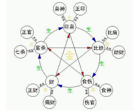 生我的五行为印星,克我的五行为官杀,我生的五行为食伤,同我的五行为比劫,我克的五行为财星。