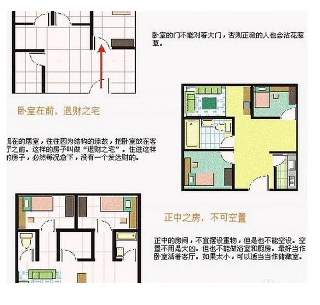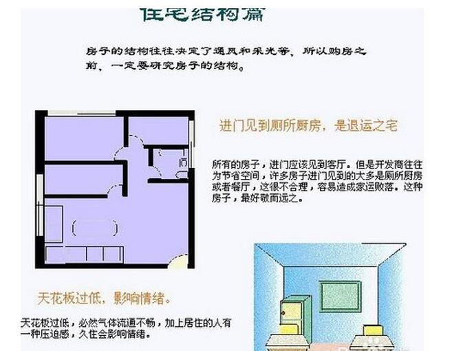 所有的屋子,入门必见客厅。现代的建筑设计,有时为了考虑空间的配置,一进门往往先见到厨房、餐厅或浴厕。这是阳宅的大忌,也不合常理,居住其中,家运必衰。卧室门不可正对大门,否则易诱使居住者耽于淫乱色欲之中。