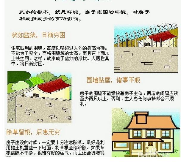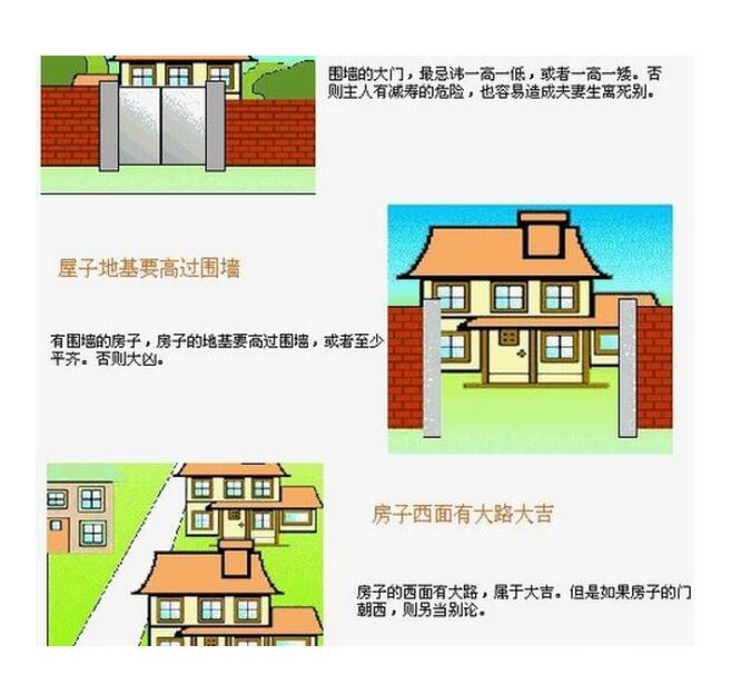 3.围墙不可以一边高一边低洼,屋子的地基要超过围墙,房子西边有马路最好