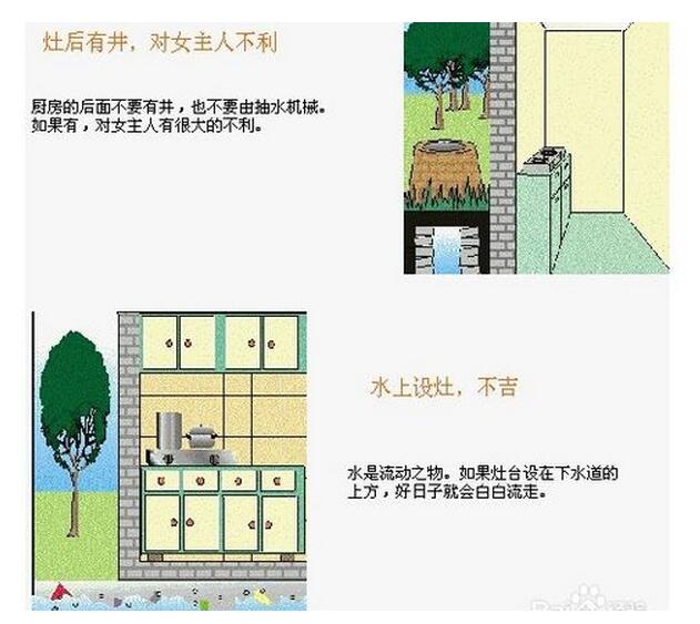 5.厨房后方设置井对女主不利,水上不可设置灶炉。