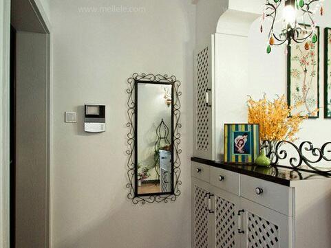 中西合璧的玄关装饰最忌两种风格特征太过明显,这样难免会主次不分,杂乱无章。狭小的玄关空间,最好避免玄关柜的直角造型,尤其是玻璃易对人造成伤害,在家具和装饰选择上应避免此种情况发生。