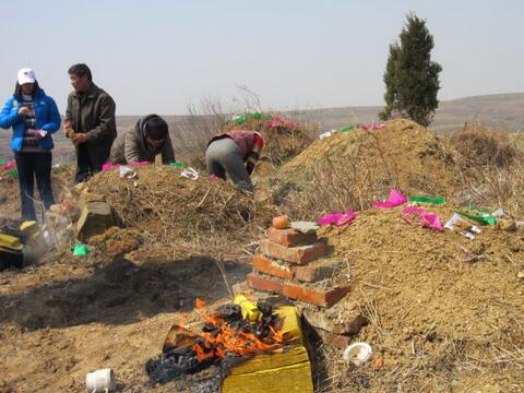 中国历史上,寒食禁火,祭奠先人,清明节扫墓祭祖成了此后持续不断的风俗传统。就是到了今天的社会,人们在清明节前后仍有上坟扫墓祭祖的习俗:铲除杂草,放上供品,于坟前上香祷祝,燃纸钱金锭,或简单地献上一束鲜花,以寄托对先人的怀念。