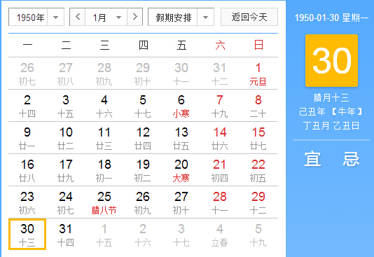 公历1950年1月30日,农历1949年12月13日,阴历一九四九己丑年十二月十三日,星期1
