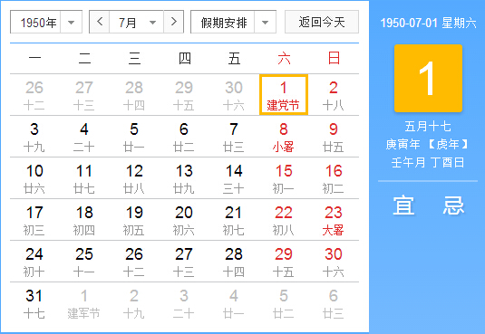 1950年7月 农历庚寅(虎)年壬午月 建国1年