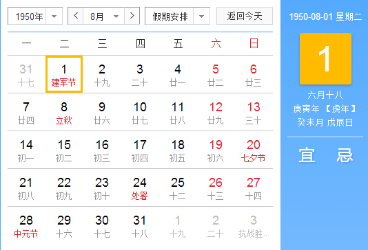 1950年8月 农历庚寅(虎)年癸未月 建国1年