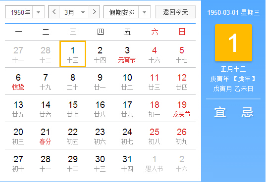 公历1950年3月1日,农历1950年1月13日,阴历一九五零庚寅年正月十三日,星期3