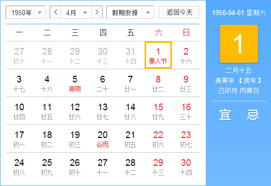公历1950年2月20日,农历1950年1月4日,阴历一九五零庚寅年正月初四日,星期1