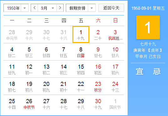 公历1950年10月11日,农历1950年9月1日,阴历一九五零庚寅年九月初一日,星期3