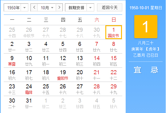 公历1950年10月10日,农历1950年8月29日,阴历一九五零庚寅年八月廿九日,星期2