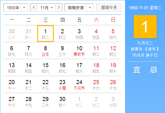 公历1950年11月1日,农历1950年9月22日,阴历一九五零庚寅年九月廿二日,星期3