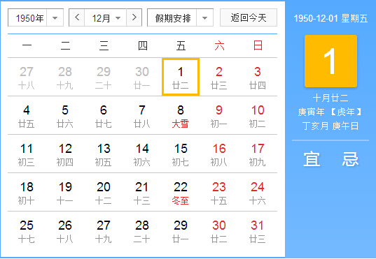 公历1950年12月1日,农历1950年10月22日,阴历一九五零庚寅年十月廿二日,星期5
