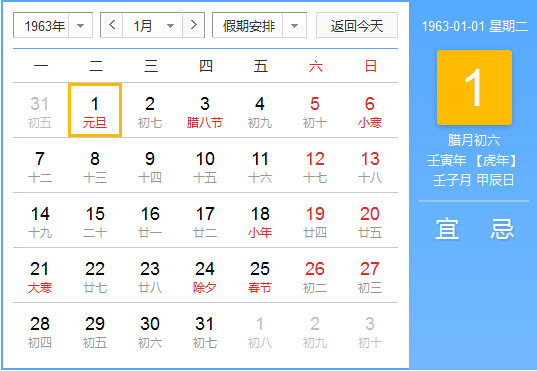 1963年春节是什么时候:1963年1月25日 星期一 农历 正月初一