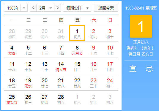 公历1963年2月1日, 农历1963年1月8日, 阴历一九六三癸卯年正月初八日,星期5