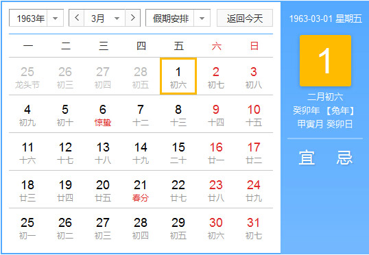 公历1963年3月1日, 农历1963年2月6日, 阴历一九六三癸卯年二月初六日,星期5