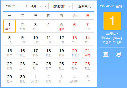 1963年4月 农历癸卯(兔)年丙辰月 建国14年