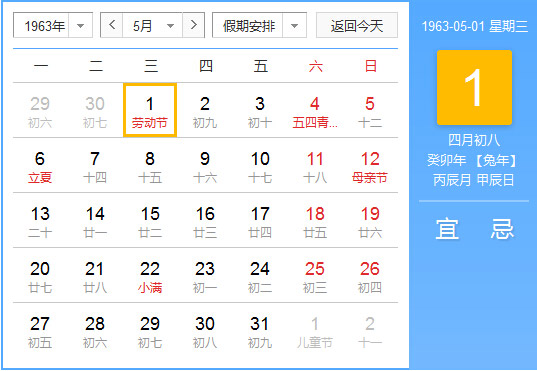 1963年5月 农历癸卯(兔)年丁巳月 建国14年