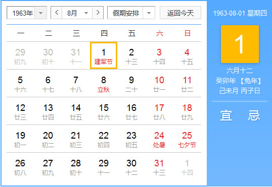 1963年8月 农历癸卯(兔)年庚申月 建国14年
