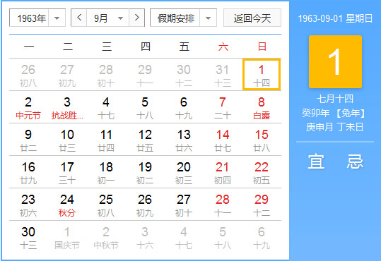 1963年9月 农历癸卯(兔)年辛酉月 建国14年