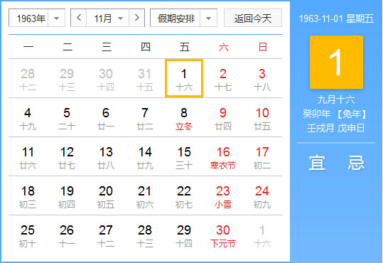 公历1963年11月1日, 农历1963年9月16日, 阴历一九六三癸卯年九月十六日,星期5