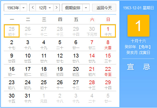 1963年12月份阴阳历一览表,1963年12月份公历农历查询表