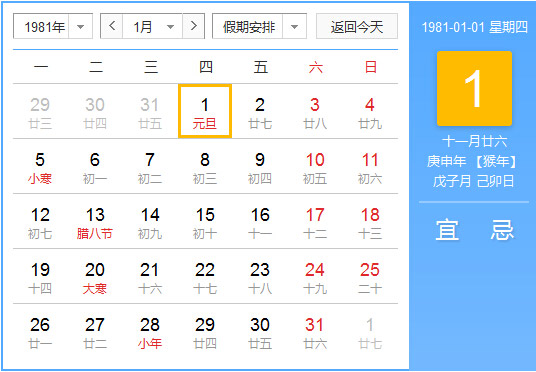1981年1月份阴阳历一览表,1981年1月份公历农历查询表