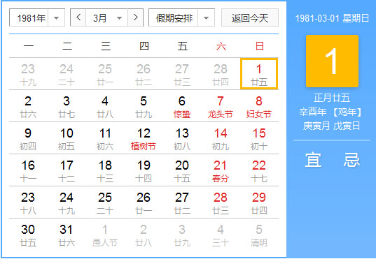 公历1981年3月1日, 农历1981年1月25日, 阴历一九八一辛酉年正月廿五日,星期7