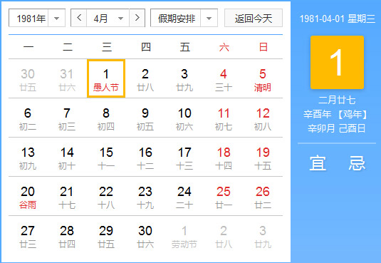 1981年4月 农历辛酉(鸡)年壬辰月 建国32年