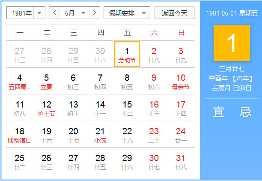 1981年5月 农历辛酉(鸡)年癸巳月 建国32年