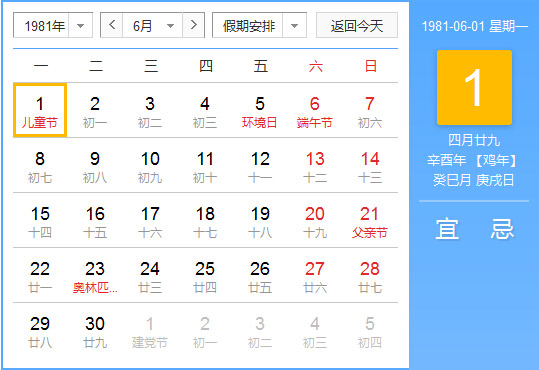 1981年6月 农历辛酉(鸡)年甲午月 建国32年