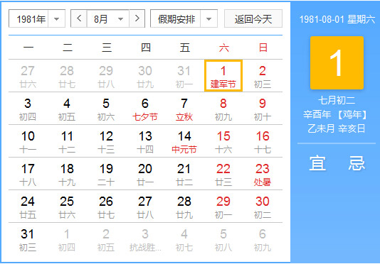1981年7月 农历辛酉(鸡)年乙未月 建国32年