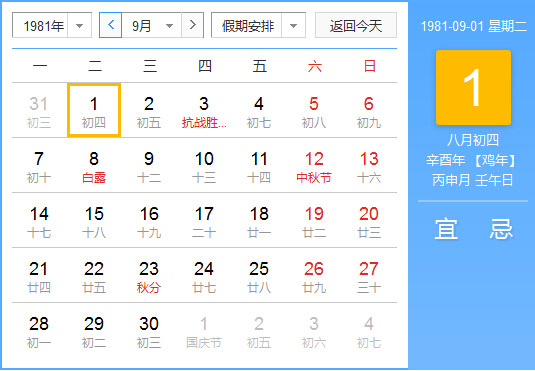 1981年9月 农历辛酉(鸡)年丁酉月 建国32年