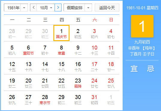 公历1981年10月28日, 农历1981年10月1日, 阴历一九八一辛酉年十月初一日,星期3