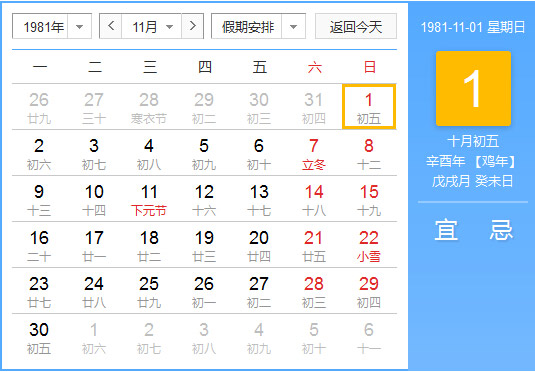 1981年11月份阴阳历一览表,1981年11月份公历农历查询表