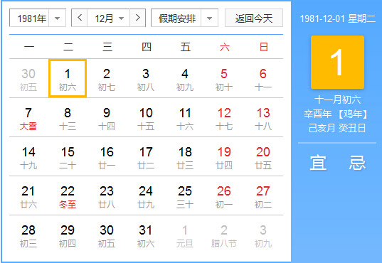 1981年12月份阴阳历一览表,1981年12月份公历农历查询表