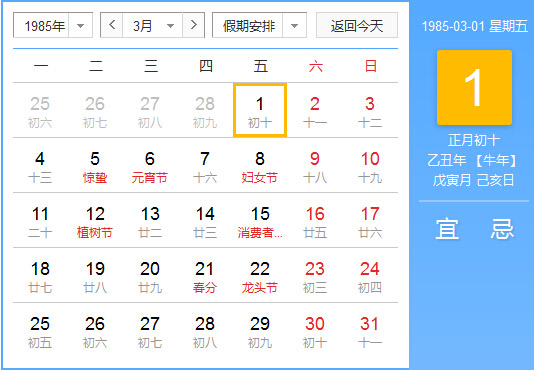 公历1985年3月1日, 农历1985年1月10日, 阴历一九八五乙丑年正月初十日,星期5