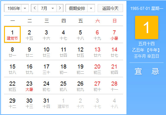 1985年7月 农历乙丑(牛)年壬午月 建国36年