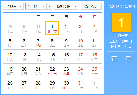 1985年8月 农历乙丑(牛)年癸未月 建国36年