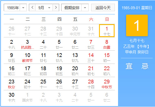 1985年9月 农历乙丑(牛)年甲申月 建国36年
