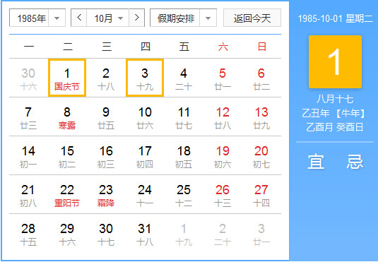 1985年10月 农历乙丑(牛)年乙酉月 建国37年