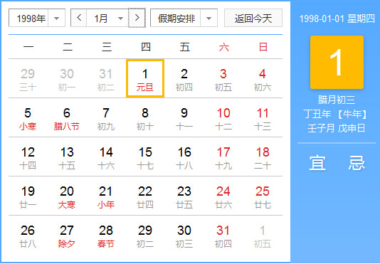 公历1998年1月1日, 农历1997年12月3日, 阴历一九九七丁丑年十二月初三日,星期4