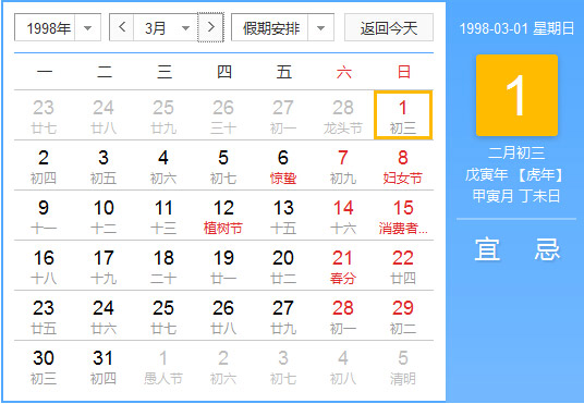 公历1998年3月1日, 农历1998年2月3日, 阴历一九九八戊寅年二月初三日,星期7