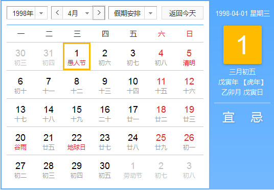 1998年4月 农历戊寅(虎)年乙卯月 建国49年