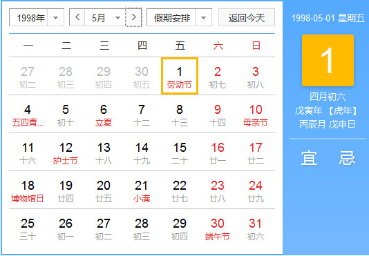 1998年5月 农历戊寅(虎)年丙辰月 建国49年
