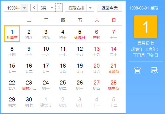1998年6月 农历戊寅(虎)年丁巳月 建国49年