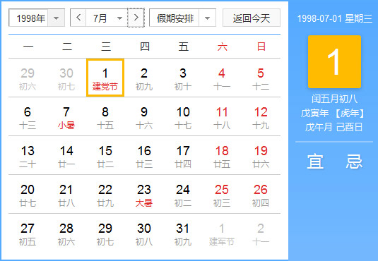1998年7月 农历戊寅(虎)年戊午月 建国49年