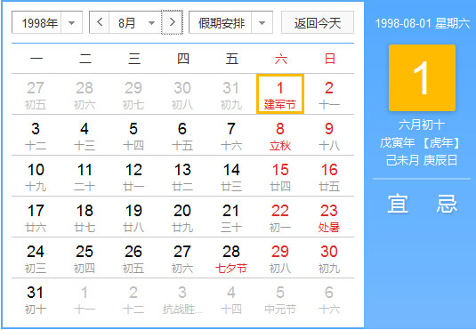 1998年8月 农历戊寅(虎)年己未月 建国49年