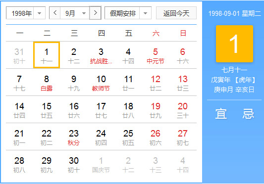 1998年9月 农历戊寅(虎)年庚申月 建国49年