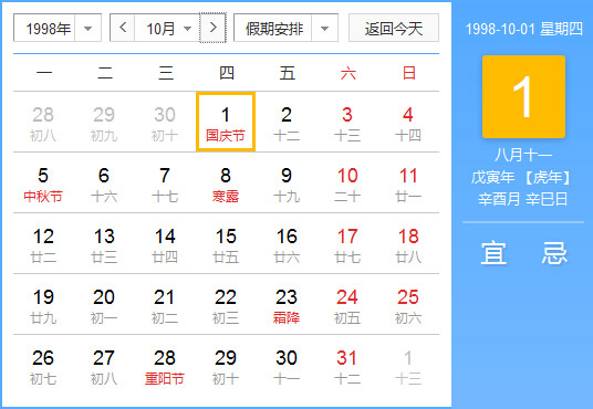1998年10月 农历戊寅(虎)年辛酉月 建国50年