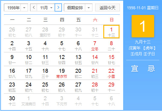 公历1998年11月1日, 农历1998年9月13日, 阴历一九九八戊寅年九月十三日,星期7